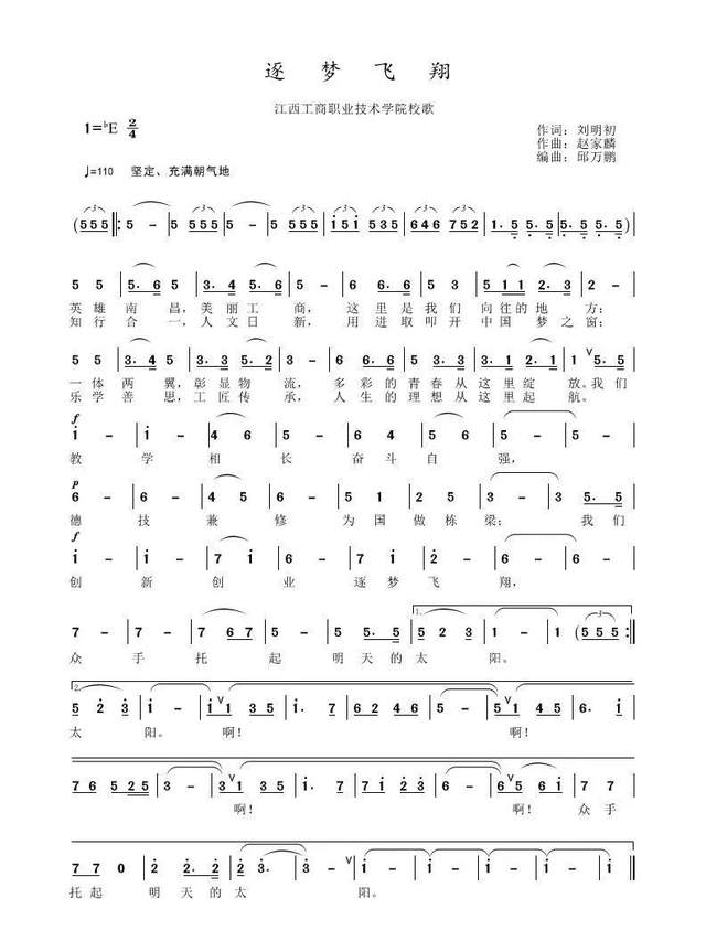 2020年,江西工商职业技术学院校歌——《逐梦飞翔》正式发布。该曲由江西工商职业技术学院校长刘明初作词,教育学院赵家麟教授作曲,教育学校老师邱万鹏编曲。
