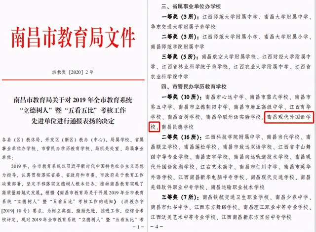 在2020年南昌市教育系统“立德树人”“五看五比”综合考评中,南昌现代外国语学校荣获一等奖。