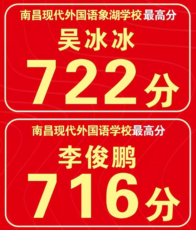2020年中考,南昌现代外国语象湖学校吴冰冰同学以722分摘得桂冠,南昌现代外国语学校李俊鹏同学以716分摘得桂冠。2020年,中考成绩700分以上9人,680分以上30人,630分以上183人,600以上252人。