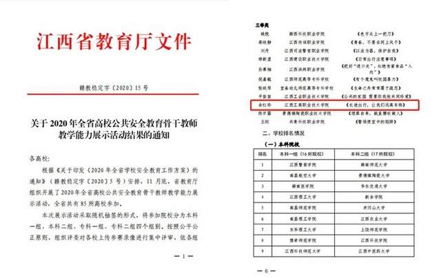 江西工商职业技术学院余红珍老师荣获2020年全省高校公共安全教育骨干教师教学能力展示活动二等奖。