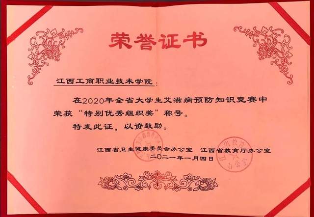 在江西省大学生预防艾滋病知识竞赛中,江西工商职业技术学院荣获“特别优秀组织奖”。