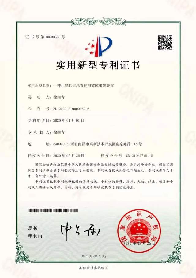 江西工商职业技术学院徐尚青老师荣获三项国家级专利。