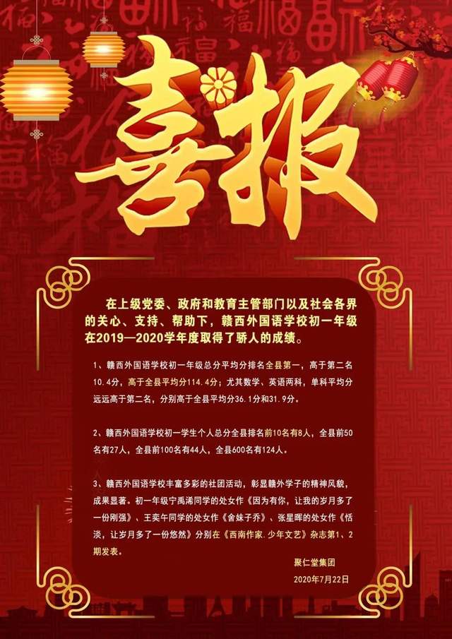 自2018年办学以来,赣西外国语学校初一年级总分平均分列万载县第一,高于第二名10.4分,高于全县平均分114.4分。
