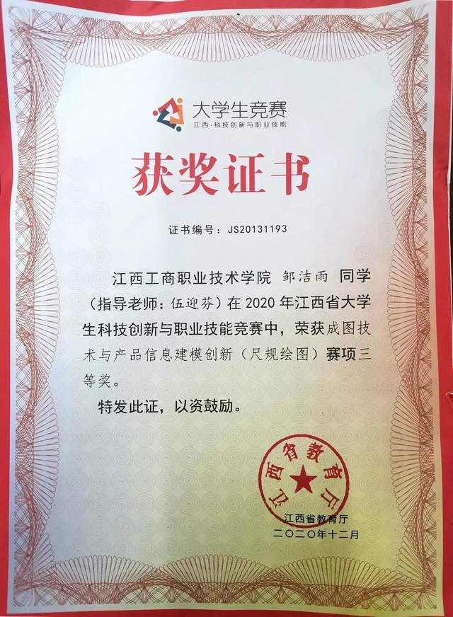 江西工商职业技术学院郭洁雨同学荣获江西省大学生科技创新与职业技能竞赛二等奖。