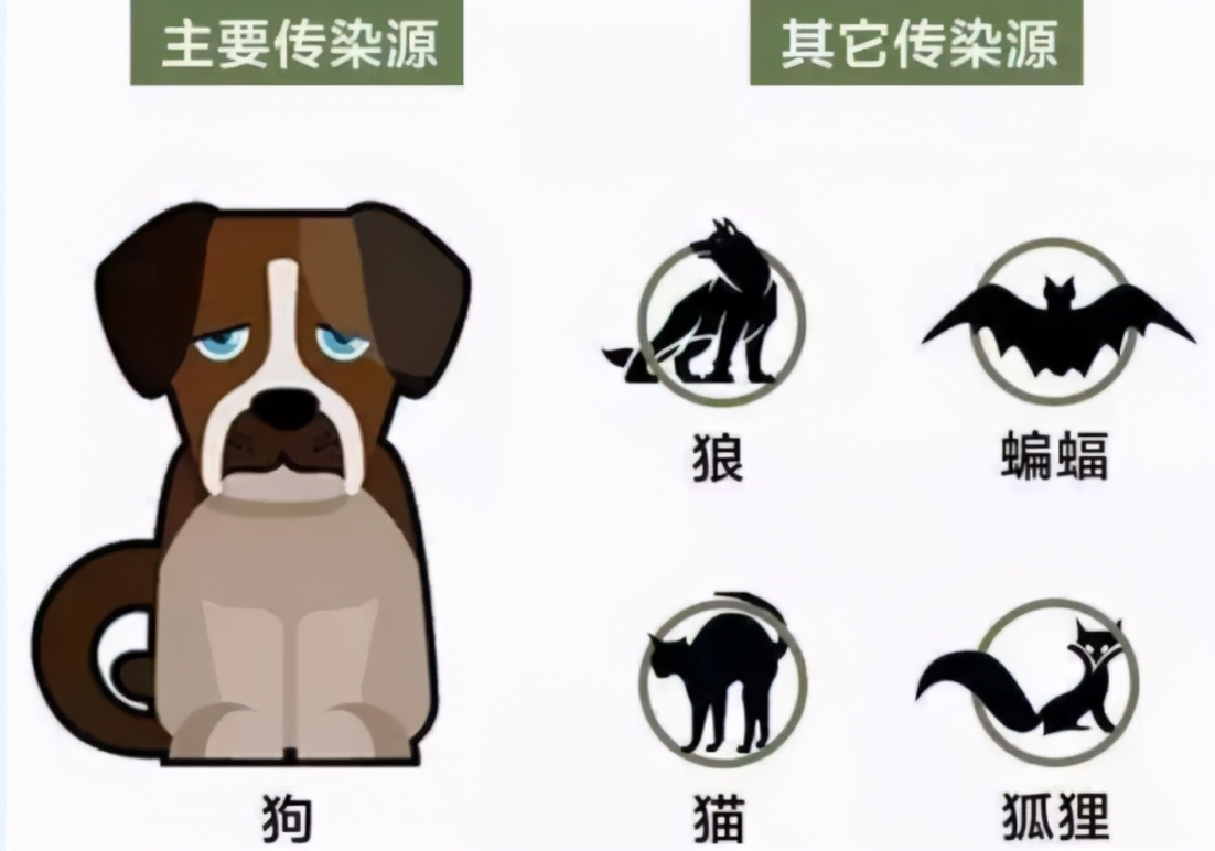 犬科动物是主要的传染源,占99%以上,猫可以引起5%的狂犬病。野生动物中狼,豺,猫鼬,狐狸,蝙蝠都可以传播狂犬病毒。