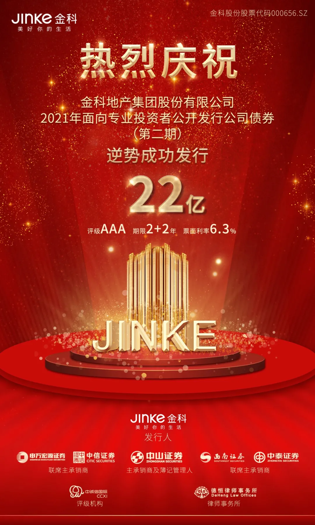 3月2日,金科地产集团股份有限公司(以下简称“金科股份”)逆势成功发行22亿元公司债券(债券简称“21金科03”),票面利率为6.3%,期限为2+2年。在当前房企债市存在诸多不利因素的背景下,金科本次小公募发行成功,充分体现优质主体在债券市场波动的情况下仍然具有较高的抗风险性。