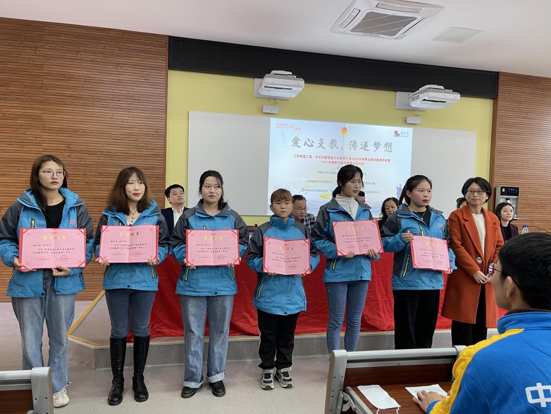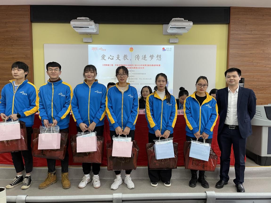 仪式上,对2020年秋季平安长期支教志愿者颁发“优秀志愿者”证书,同时,共青团赣州市委为赣州师范高等专科学校授“新时代文明实践赣南青年志愿服务队赣州师专分队”队旗,平安人寿赣州中心支公司总经理丁健为志愿者发放防疫物资,他们将“接力”本次支教行动,为边远山区的学生们带去希望,为红土赣南带去无尽生命力。
