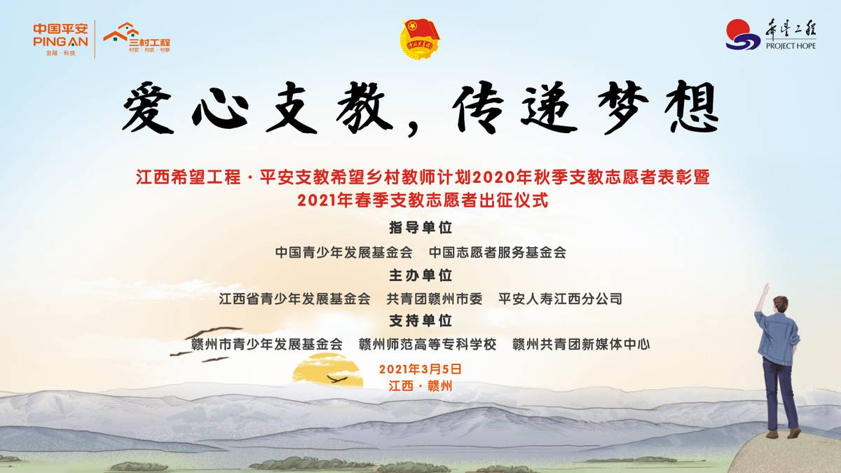 江西消费网讯 2021年3月5日,江西希望工程·平安支教志愿者行动2020秋季支教志愿者表彰仪式暨2021年春季支教志愿者出征仪式于赣州师范高等专科学校顺利举办,该项目由平安人寿江西分公司联合江西省青少年发展基金会、共青团赣州市委共同开展,旨在向赣州36所乡村小学输送师资力量,助力学校教学水平提升和师资能力建设。