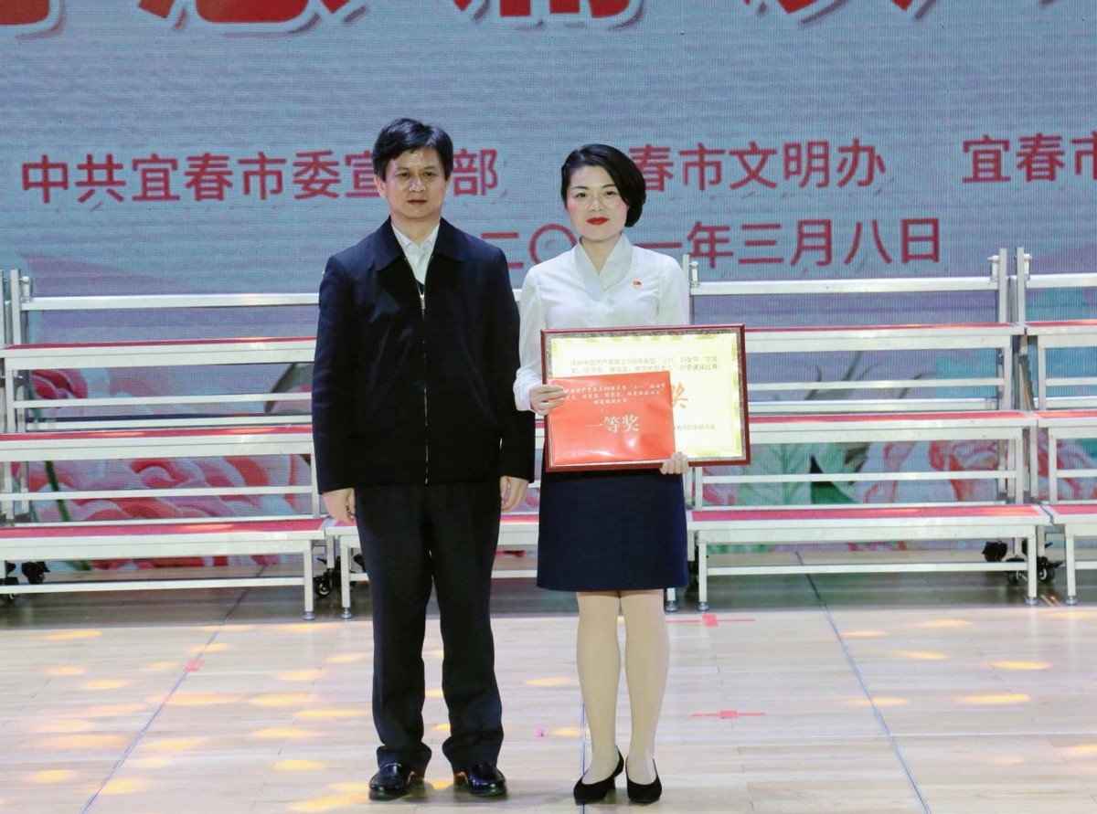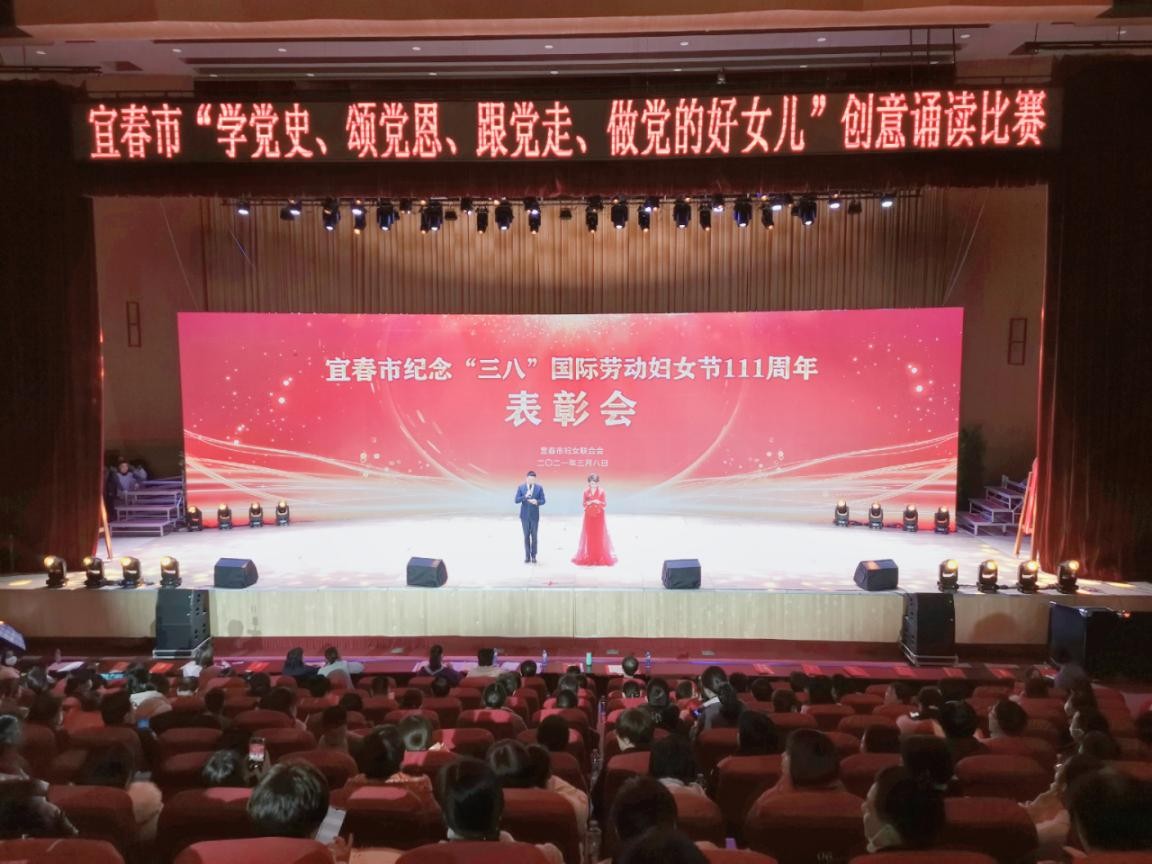 本网讯(朱宜平报道)读红色经典,重拾峥嵘岁月里的记忆,重温革命历史的情怀。为庆祝中国共产党成立100周年,纪念“三八”国际妇女节111周年,3月8日,中共宜春市委宣传部、宜春市文明办、宜春市妇联在科技之窗音乐厅联合举办庆祝中国共产党成立100周年暨“三八”妇女节“学党史、颂党恩、跟党走、做党的好女儿”创意诵读比赛。市委常委、组织部部长余正琨,市人大常委会副主任宋交根,市人大常委会一级巡视员易斌,市政府副市长、公安局局长夏红色,市政协副主席蔡佩兰、孙国琴,宜春学院党委委员、副校长蒋钰、余新卫,市妇联党组书记、主席曾莹出席活动并上台颁奖。