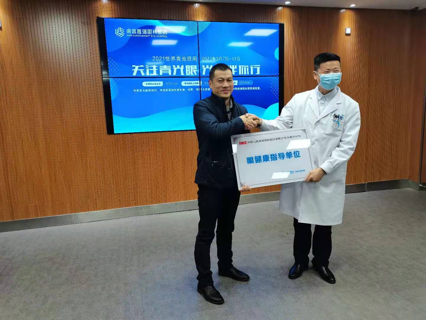 作为南昌普瑞眼科医院战略合作伙伴的中国人民健康保险股份有限公司江西分公司,非常注重员工眼健康的管理和保护。活动当天,公司领导陈总等一行来到现场,认真听完了整堂课程,并授予南昌普瑞眼科医院为公司的"眼健康指导单位"。同时,陈总还希望杨院长能抽空为中国人民健康保险股份有限公司江西分公司的员工进行眼健康知识的普及教育。
