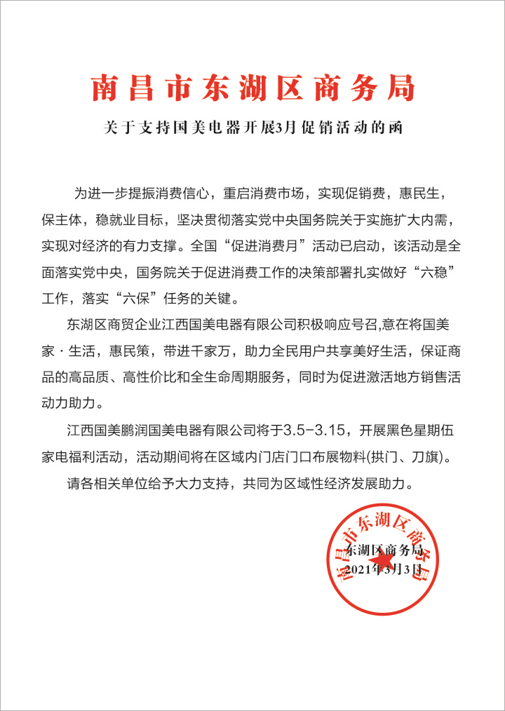春暖花开,万物复苏,又到了新春装修、“焕新家”的季节,这正是释放人民消费需求的良好契机。国美零售江西区域分公司积极响应政府号召,在得到南昌市东湖区商务局大力支持下,在国美“家.生活”战略成功进入第二阶段的背景下,将”以科技提升效率,以智慧创造美好“的企业使命,惠民策带进千家万户,助力全民用户共享美好生活,保证商品的高品质,高性价比和全生命周期服务,线上线下双平台为促进南昌市消费市场活力共同发力。
