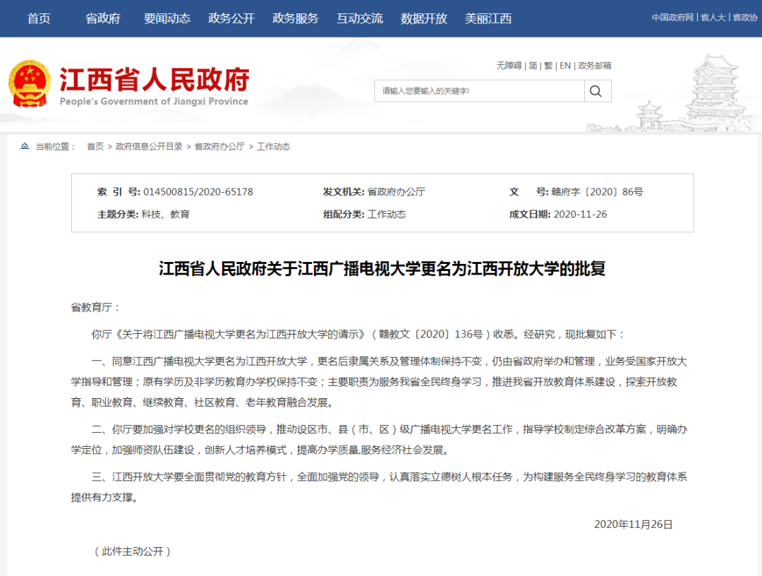 一、同意江西广播电视大学更名为江西开放大学,更名后隶属关系及管理体制保持不变,仍由省政府举办和管理,业务受国家开放大学指导和管理;原有学历及非学历教育办学权保持不变;主要职责为服务我省全民终身学习,推进我省开放教育体系建设,探索开放教育、职业教育、继续教育、社区教育、老年教育融合发展。