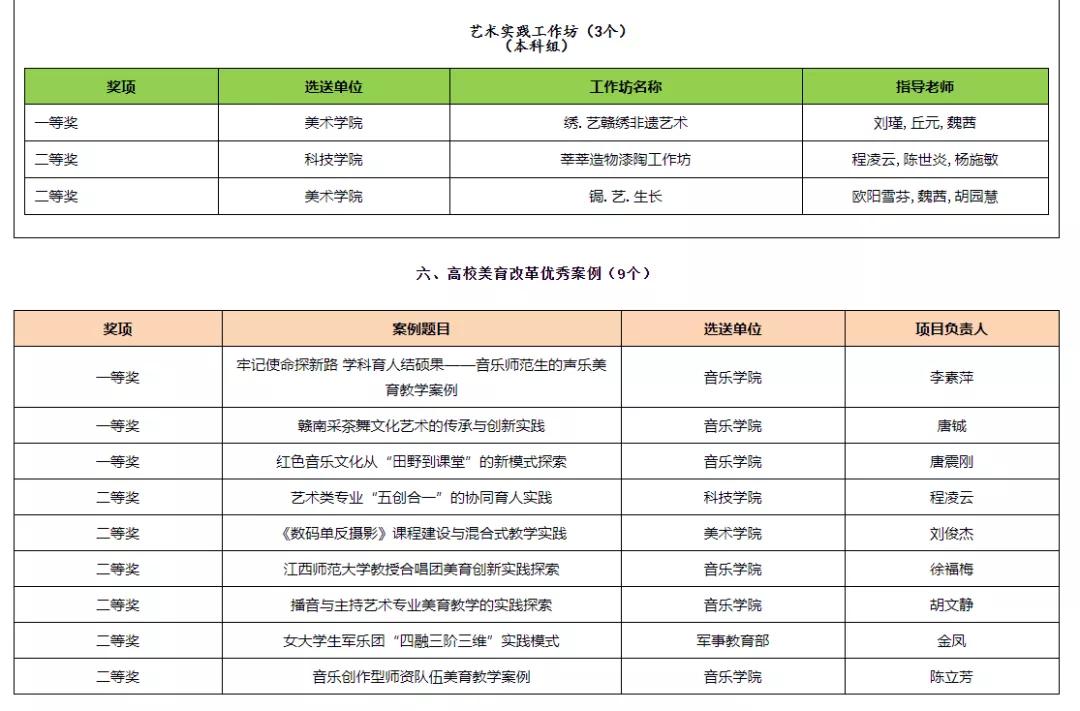 近日,由省教育厅主办的江西省第十届大学生艺术展演活动落下帷幕。通过校内选拔,江西师范大学选送的多件作品在活动中获奖,其中学校荣获优秀组织奖,艺术表演类获一等奖11个、二等奖6个、三等奖4个、优秀创作奖7个,艺术作品类获一等奖6个、二等奖31个、三等奖6个,艺术实践工作坊获一等奖1个、二等奖2个,高校美育改革优秀案例获一等奖3个、二等奖6个,在获奖类别、获奖等级和获奖数量上均位居全省高校前列。