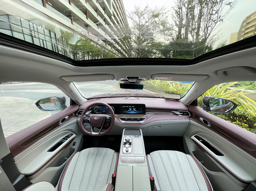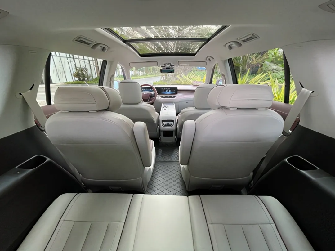 空间布局方面为独立6座布局,头等舱布局则体现在第二排,前后可电动调节、还有加热通风,中间还有扶手。座椅的舒适性与质感都相当不错,有超细纤维皮质、真皮两种材质。在色彩搭配上共有3种,主打色为晨曦白,尽显大气与高贵。并有22处储物空间,大幅增加日常实用性,整体更加整洁。