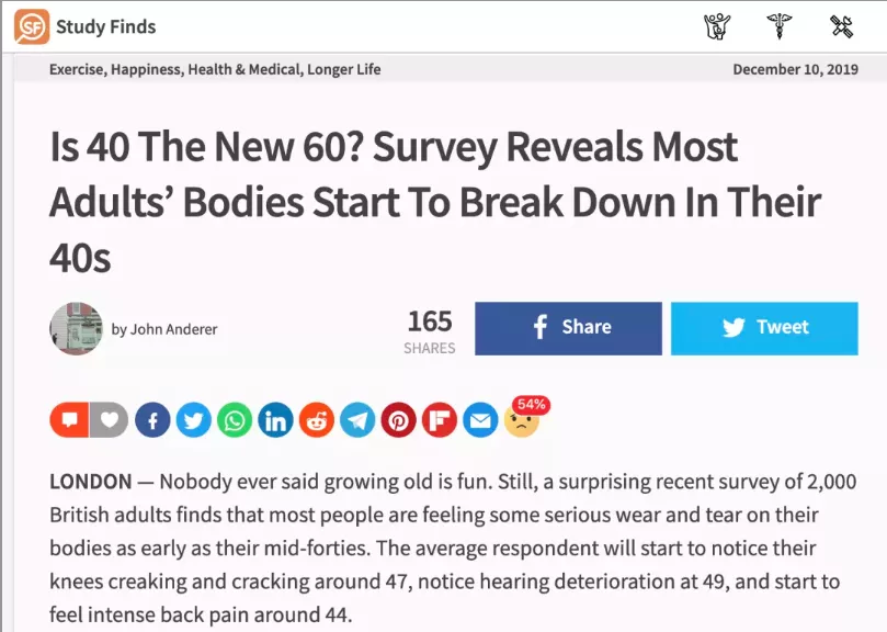 2019年10月,英国一项调查发现,多数人从40多岁就明显感觉健康在走下坡路,这项调查研究涉及2000多人,大部分受访者表示,37~40岁身体开始出现健康问题。通常,人们44岁左右感觉到背痛,46岁嗅觉变得迟钝,47岁左右膝盖出现异常、脚踝力量变弱,49岁左右听力下降并出现关节疼痛。而视力最早在20多岁就开始恶化。