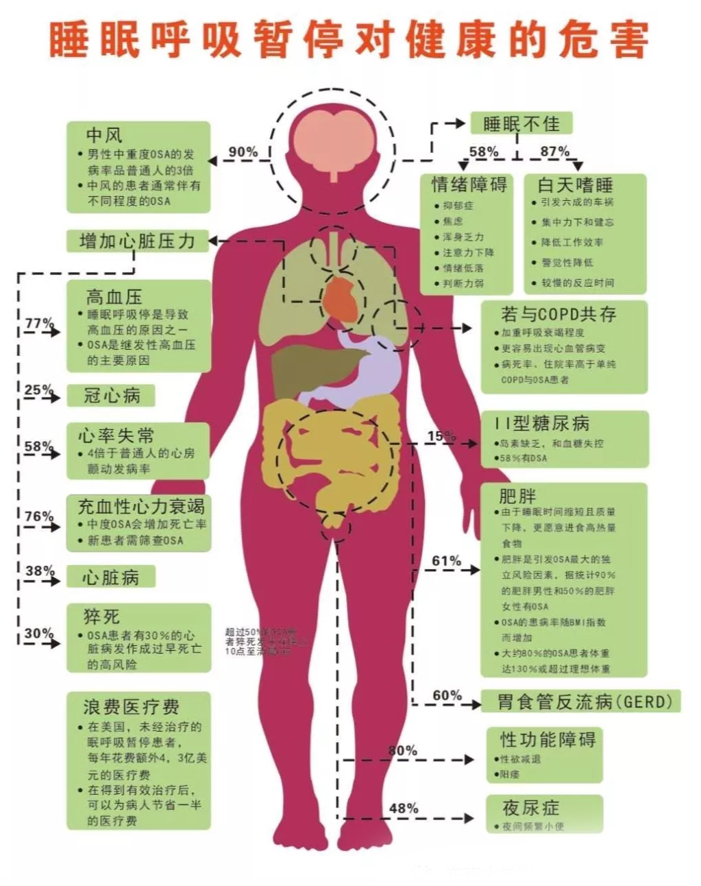 睡眠呼吸障碍暂停综合征:如打鼾、晨起头痛、头晕和口干、白天嗜睡、夜间心悸胸闷、不明原因的高血压、性情改变、精力不集中、反应迟钝、记忆力减退、夜尿增加,建议筛查阻塞性睡眠呼吸暂停综合征(OSAHS);