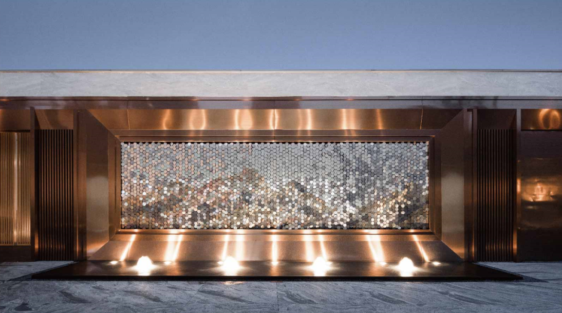 在这个项目中,“集美天宸”还以《蓬莱仙境图》为素材,匠人匠心的用金属片壁画的形式设计了照壁,凸显宏伟泰山的同时也让儒家文化的“仁者乐山,智者乐水”的精神内核巧妙呈现出来。