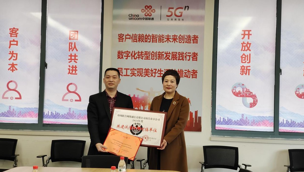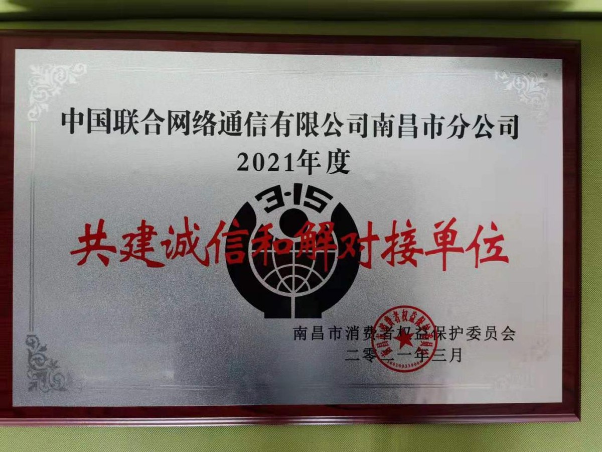 江西消费网讯(魏荣)报道:3月17日上午,南昌市消费者权益保护委员会秘书长吴荣玲一行4人来到南昌联通,向公司颁发2021年度“共建诚信和解对接单位”牌匾和证书。