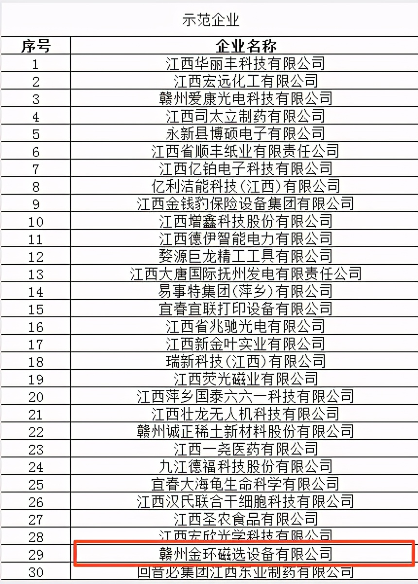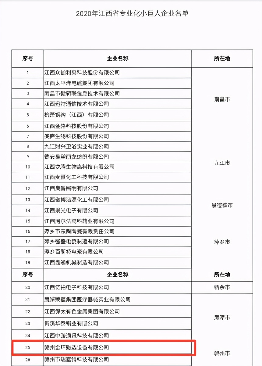 日前,从江西省工信厅获悉,赣州金环磁选设备有限公司被认定为2020年省级两化深度融合示范企业和2020年省级专业化小巨人企业。