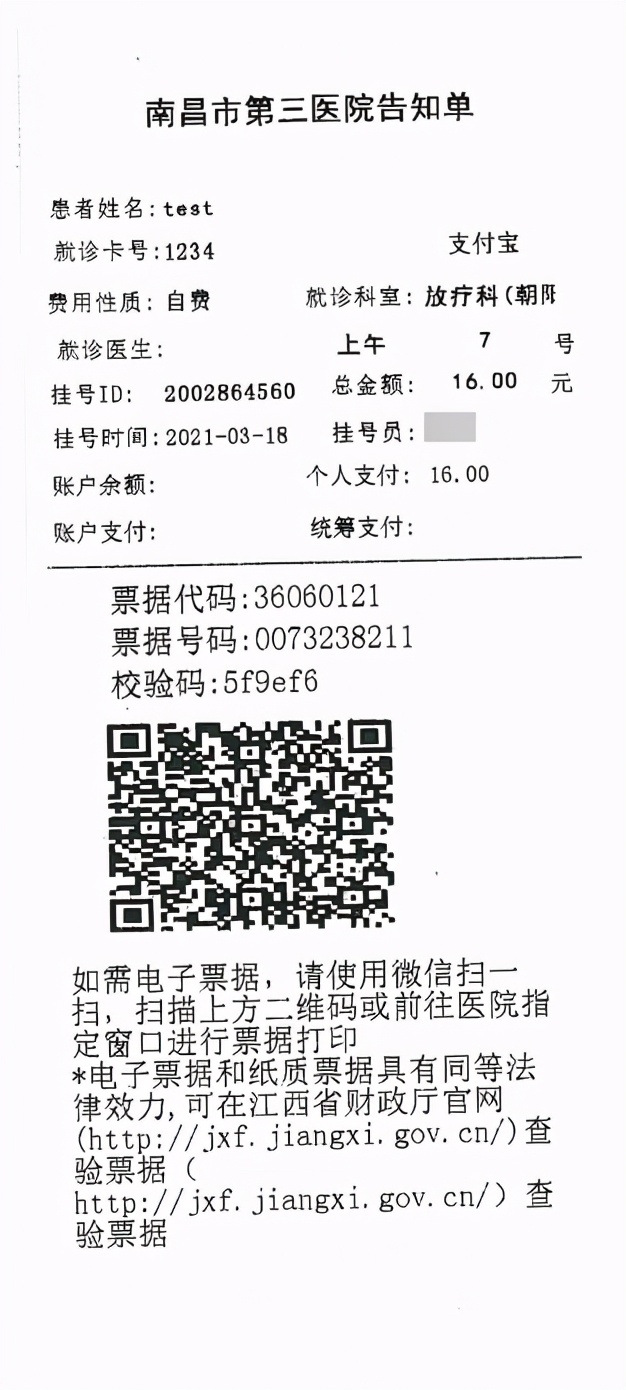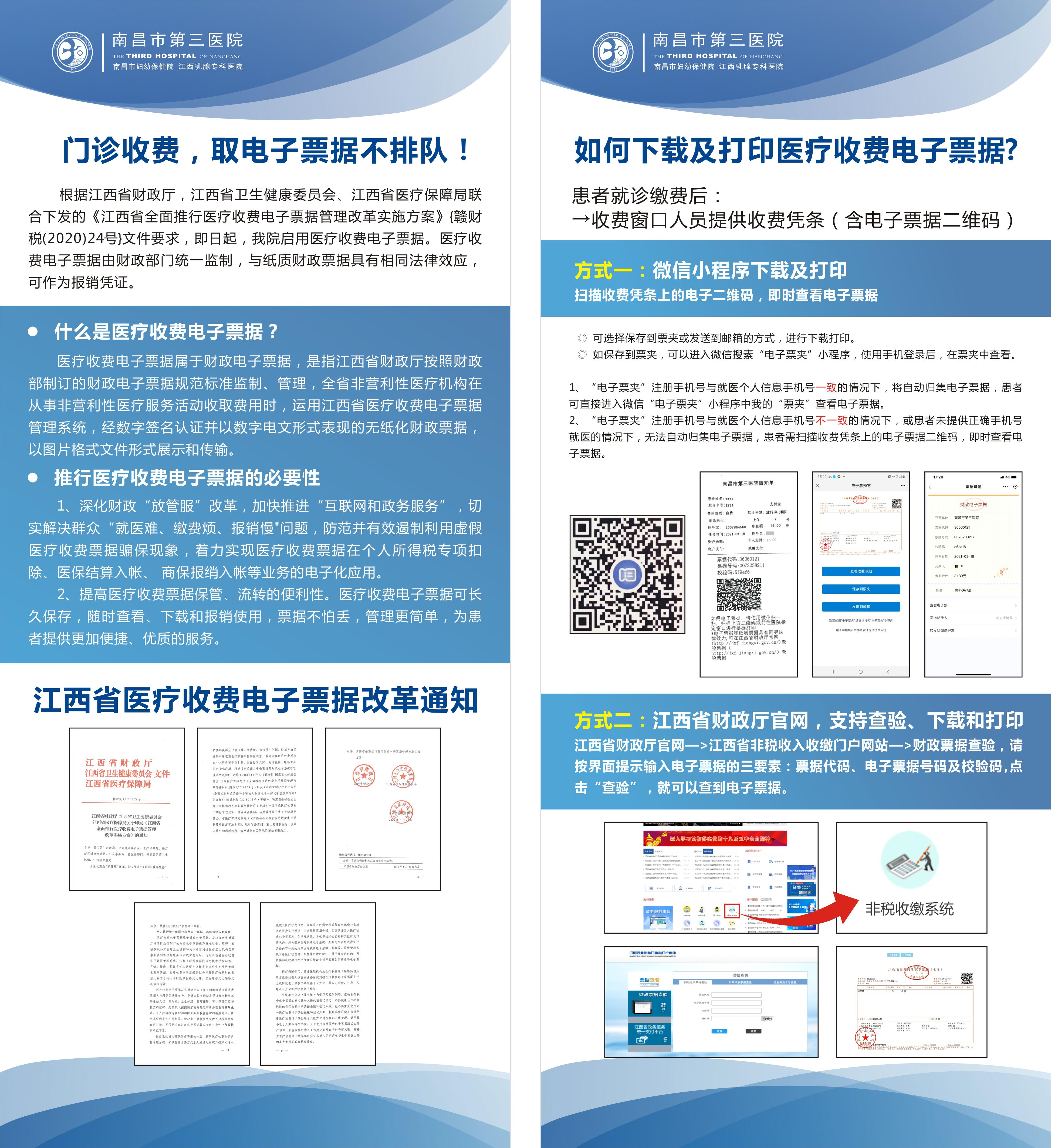 根据江西省财政厅、卫健委、医保局下发的《关于全面推行医疗收费电子票据管理改革的通知》的文件要求,市财政、卫健委、医保部门的统一安排部署,南昌市第三医院顺利完成自身业务系统的改造和财政电子票据管理平台的对接,成功上线运行医疗电子票据管理平台,目前率先在朝阳院区门诊收费处试运行,接下来将陆续开通抚河院区门诊收费及朝阳、抚河住院收费电子票据系统。