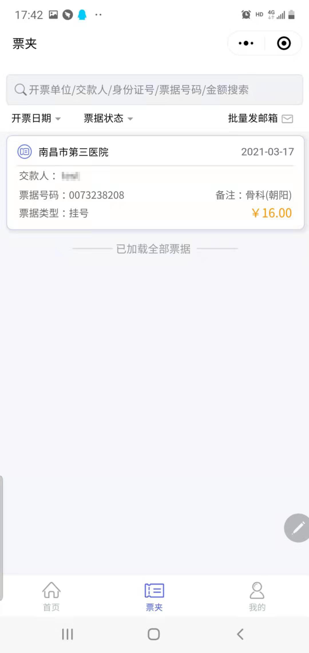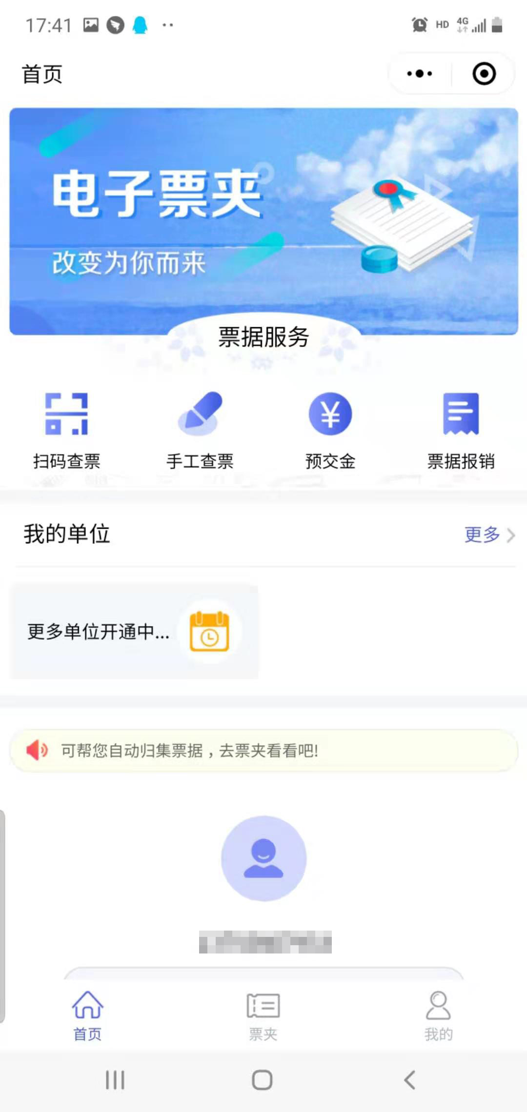 1、"电子票夹"注册手机号与就医个人信息手机号一致的情况下,将自动归集电子票据,患者可直接进入微信"电子票夹"小程序—>我的"票夹"查看电子票据。