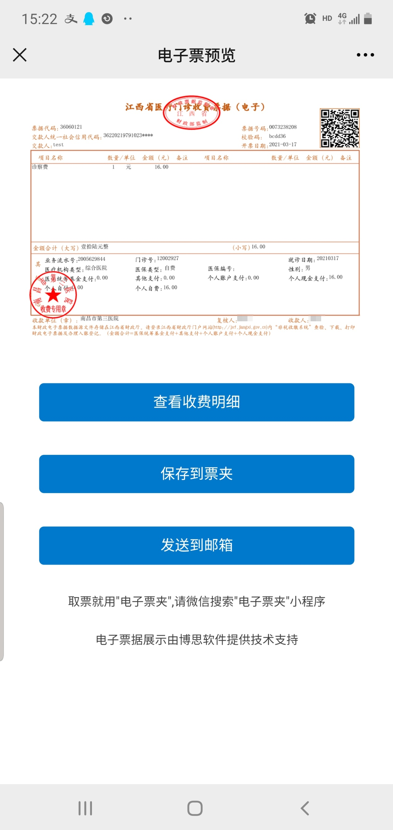 2、"电子票夹"注册手机号与就医个人信息手机号不一致的情况下,或患者未提供正确手机号就医的情况下,无法自动归集电子票据,患者需扫描收费凭条上的电子票据二维码,即时查看电子票据。