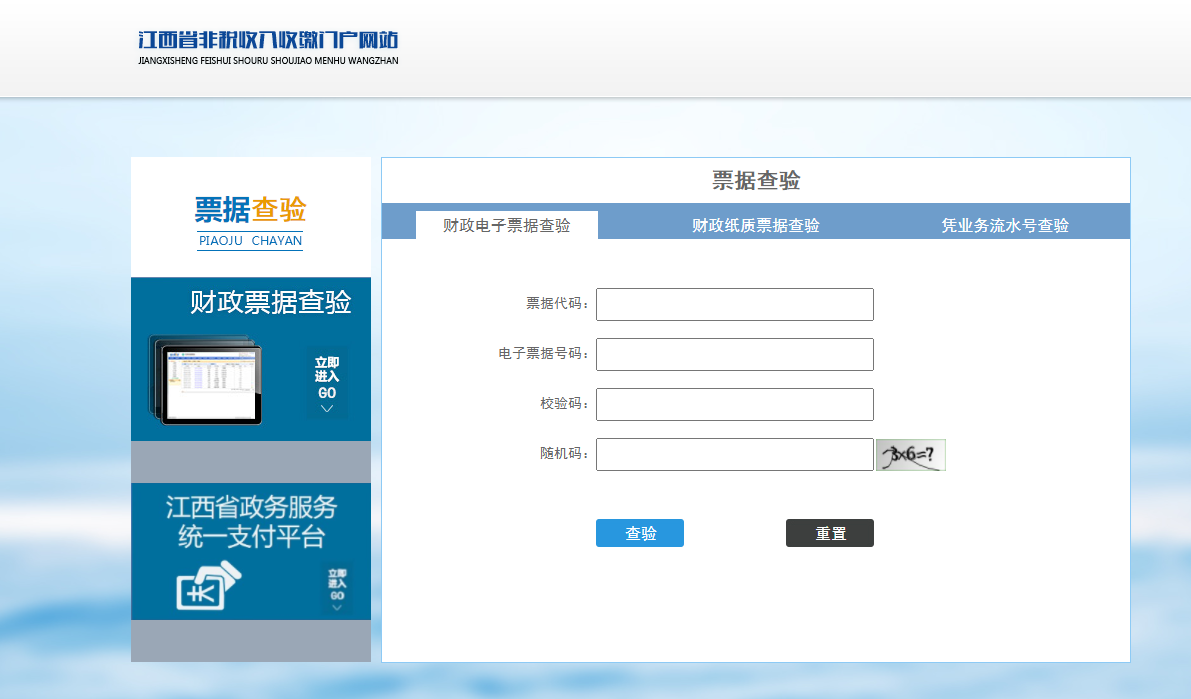 财政厅官网—>江西省非税收入收缴门户网站—>财政票据查验,请按界面提示输入电子票据的三要素:票据代码、电子票据号码及校验码,点击"查验",就可以查到电子票据。