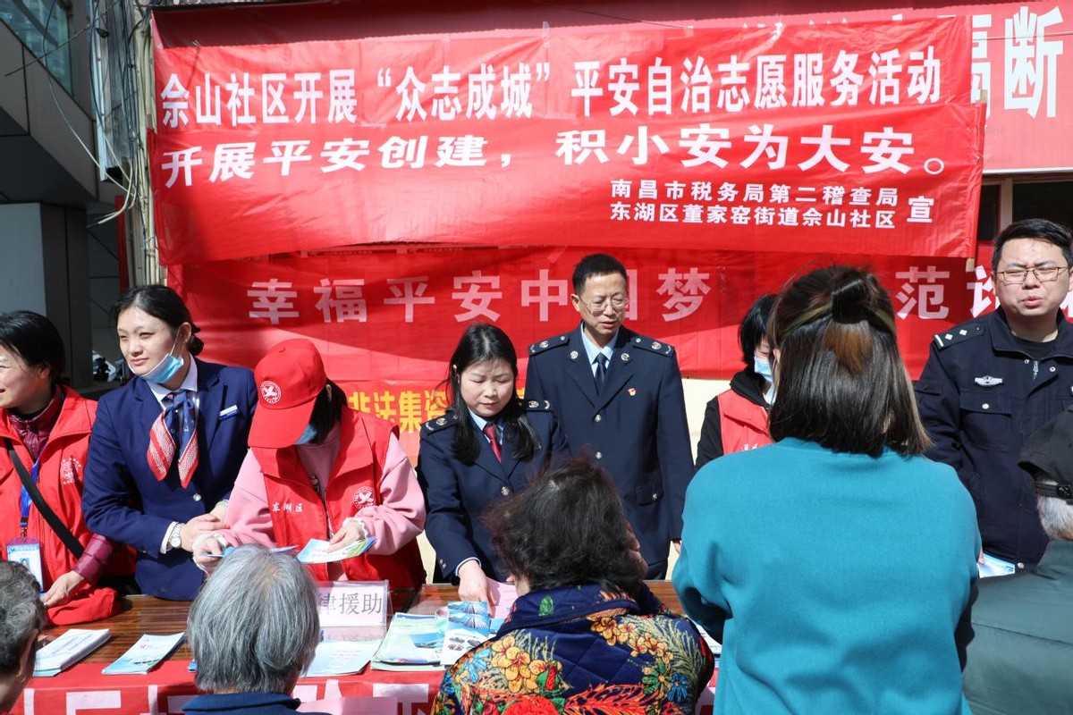 江西消费网讯(邓仰耀)报道:为全面提升广大群众参与社会治安综合治理工作的积极性,营造共创、共建、共享的社会环境,提升人民群众安全感和满意度。3月23日下午15时,南昌市税务局第二稽查局积极参与董家窑街道佘山社区与董家窑派出所、董家窑“626”工作站及交通银行在青山南路433号联合开展的以“平安创建积小安为大安”为主题的综治宣传月活动。