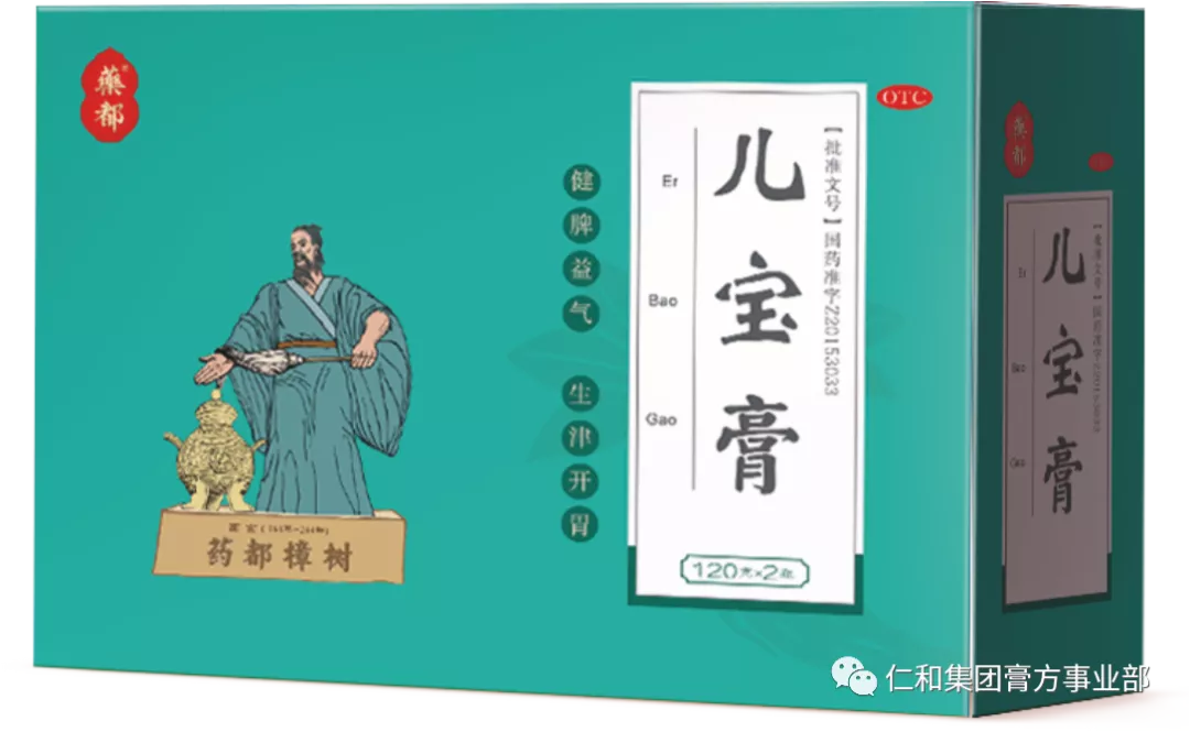 儿宝膏:味甜、微酸。主要成份:太子参、北沙参、茯苓、山药、山楂(炒)、麦芽(炒)、白扁豆(炒)、陈皮、白芍(炒)、麦冬、葛根(煨)。具有健脾益气,生津开胃,消食化滞的功效。本品可脾胃同调,虚实并治。方中太子参、山药、茯苓健脾益气,对因脾气虚弱,运化失司,气血不足而致的气虚头晕无力、精神不振、手足不温、面色无华等症有效;白芍(炒)、麦冬、北沙参可以滋养肺胃之阴,对因积食有热,或者油炸辛辣的食物的燥热之邪,灼伤肺胃之阴造成的口干、口渴、舌躁、咳嗽也有非常好的治疗效果;山楂(炒)、麦芽(炒)、陈皮可行气消食化滞,有效解决孩子口臭,粪便臭,腹胀,厌食的积食症状;白扁豆(炒)、葛根(煨)可升阳止泻,还可有效解决孩子泄泻、拉肚子的问题。