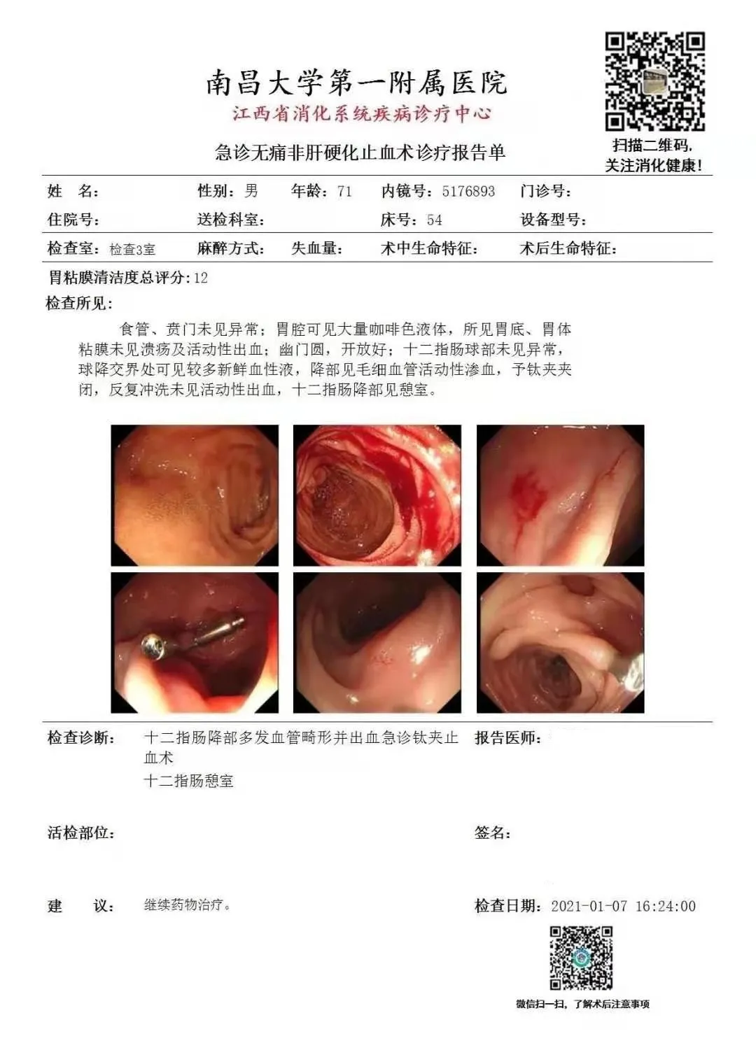 急诊胃镜示:十二指肠降段活动性渗血,予钛夹夹闭,检查诊断:十二指肠降段多发血管畸形并出血急诊钛夹止血术。