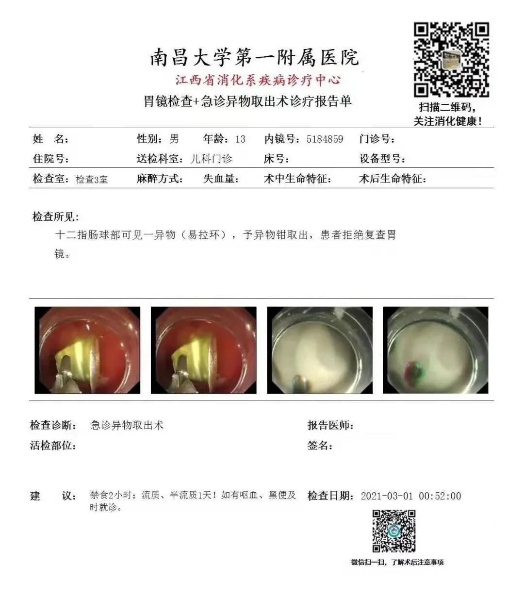 病例一:男,13岁,误食异物10小时,至儿科就诊。