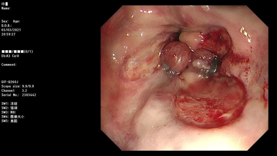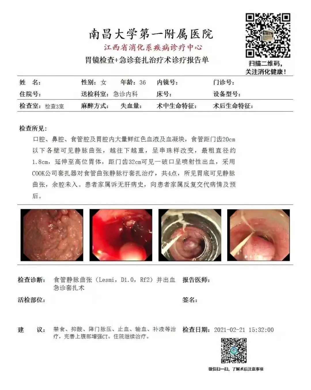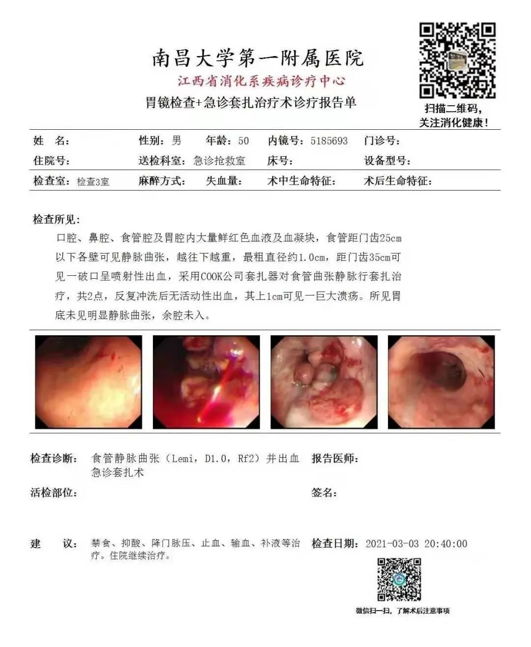 急诊胃镜示:食管距门齿35cm、32处各可见一破口活动性出血,予套扎器套扎治疗,术后无活动性出血,检查诊断:食管静脉曲张破裂出血急诊套扎术,食管套扎术后改变。