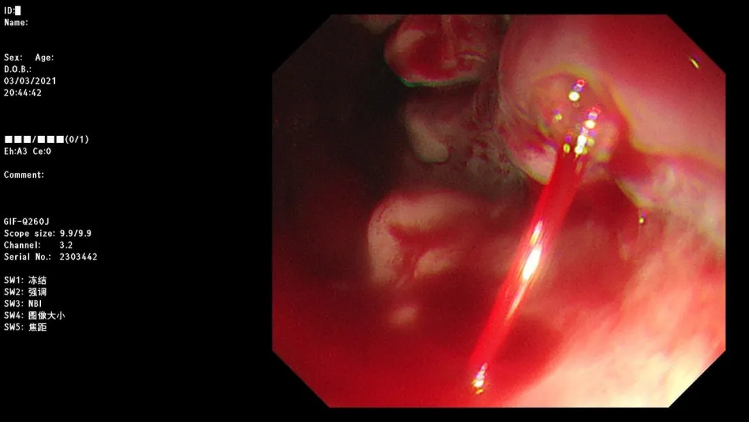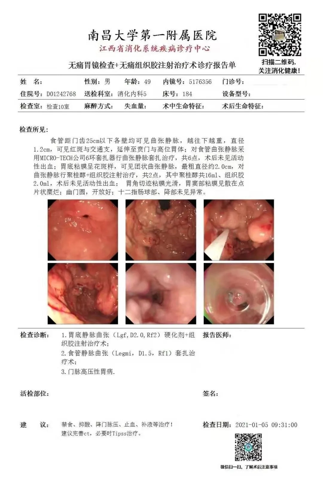 胃镜示:食管胃底静脉曲张,予胃底静脉曲张硬化剂+组织胶注射术,食管曲张静脉曲张套扎术。
