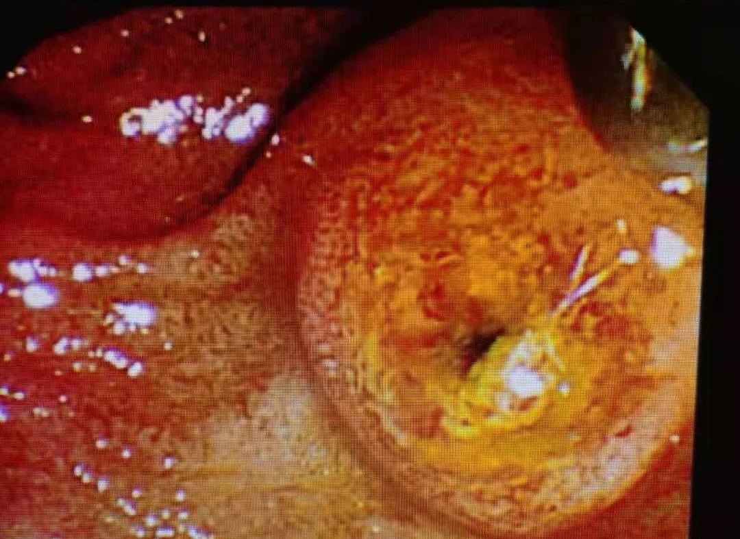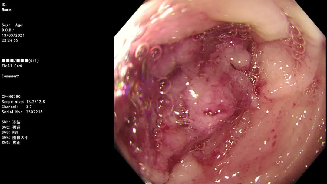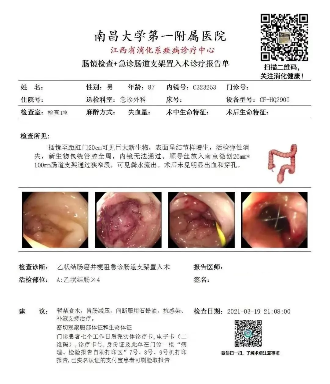 急诊肠镜示:距肛门20cm新生物,占据肠腔全周,放入肠道支架通过狭窄段,粪水流出,检查诊断:乙状结肠癌并梗阻急诊肠道支架置入术。