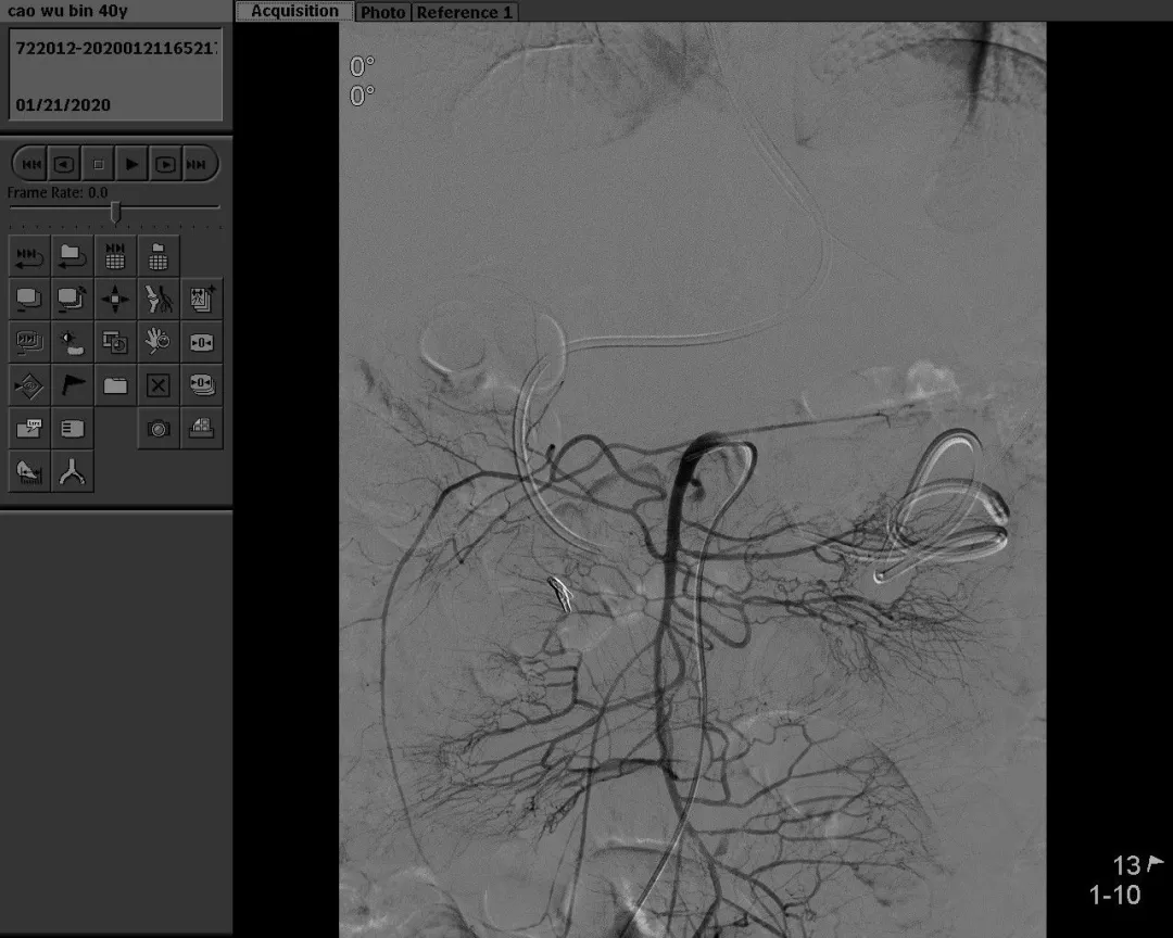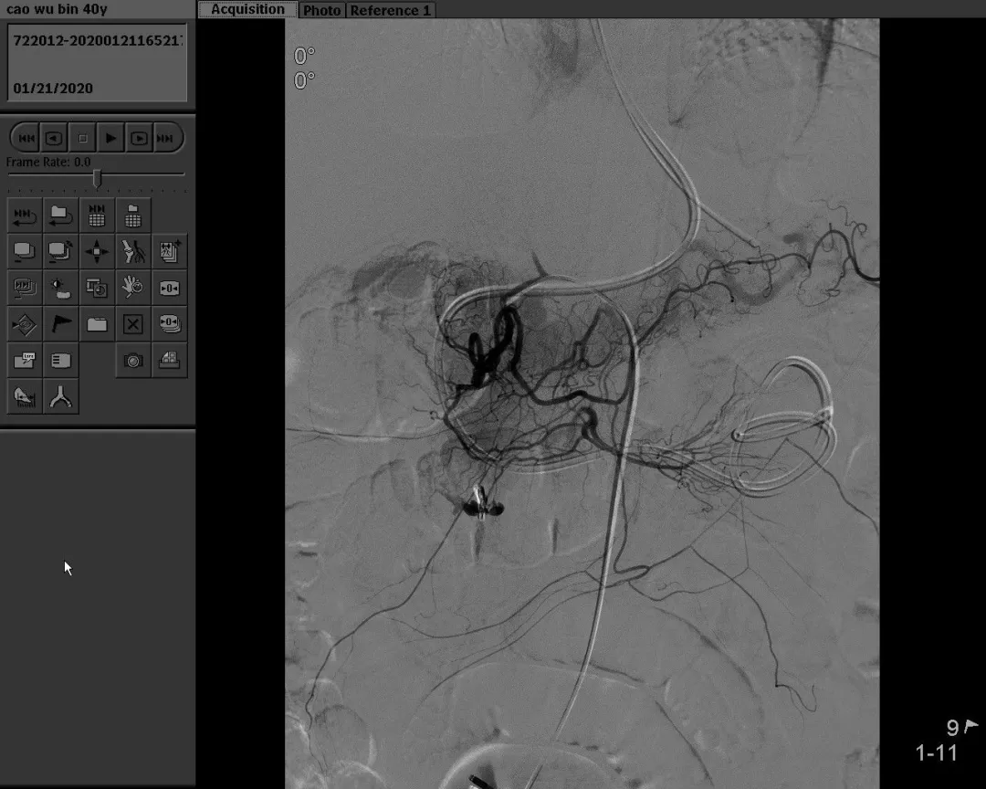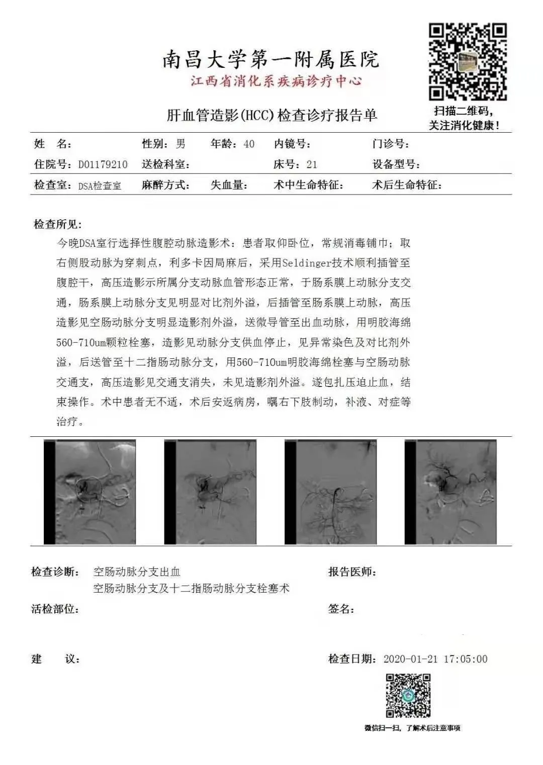 急诊DSA示:空肠动脉分支出血,予空肠动脉栓塞术。