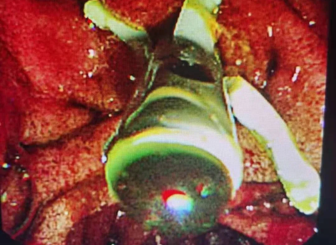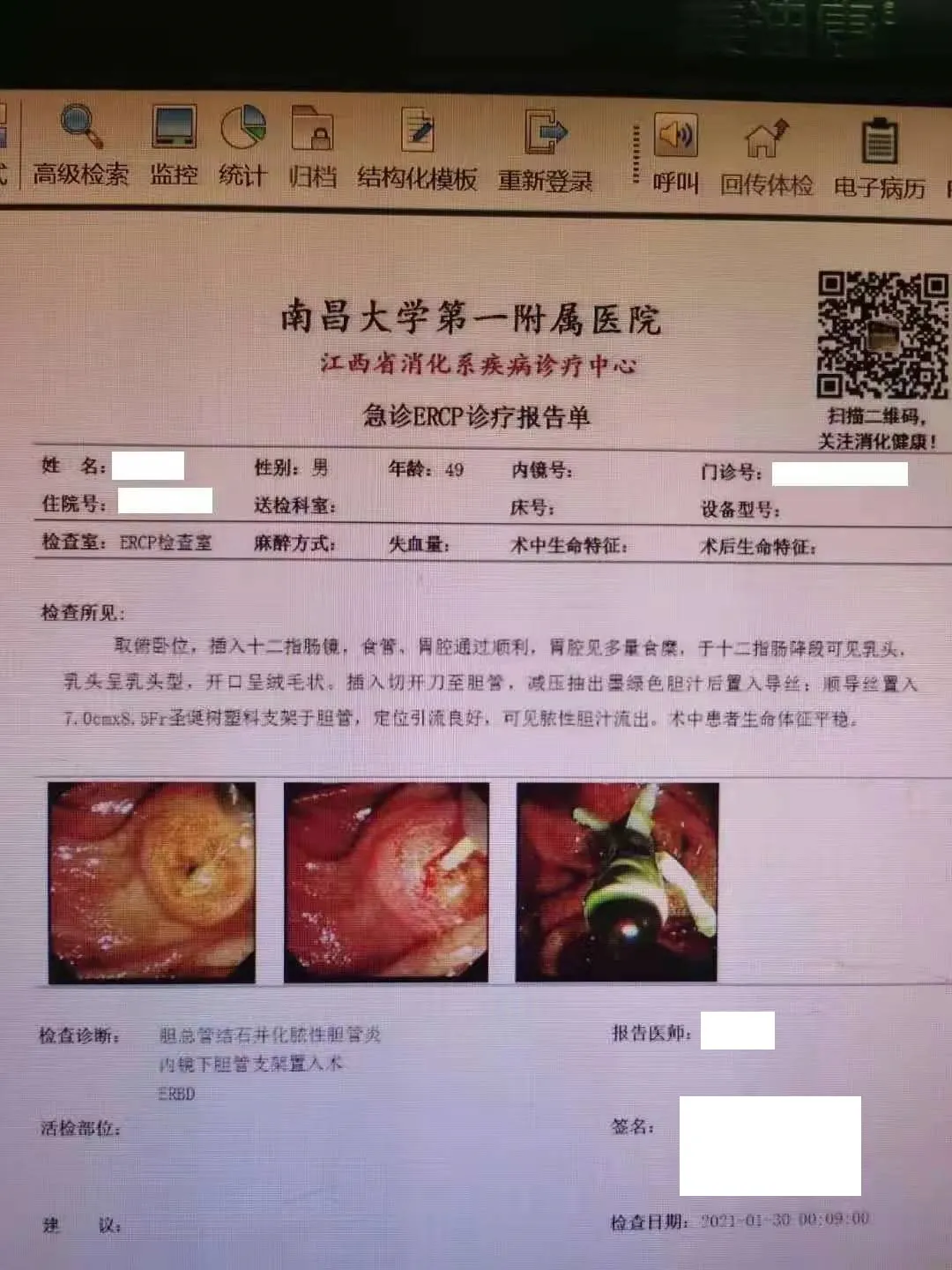 急诊ERCP示:置管后可见脓性胆汁流出,检查诊断:胆总管结石并急性化脓性胆管炎,内镜下胆管支架置入术。