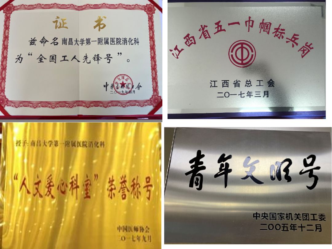 - 2020年:“高难度消化内镜手术相关并发症防治的关键技术及临床应用”获江西省科技进步一等奖;“软式内镜清洗消毒关键技术的系列研究与推广应用”获江西省科技进步三等奖;“单磷酸腺苷激活蛋白激酶的激活及其肿瘤转移抑制作用与机制”江西省自然科学三等奖。