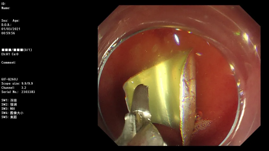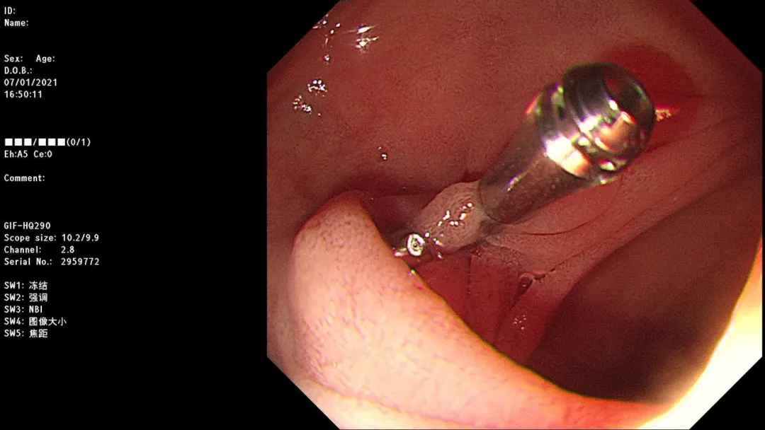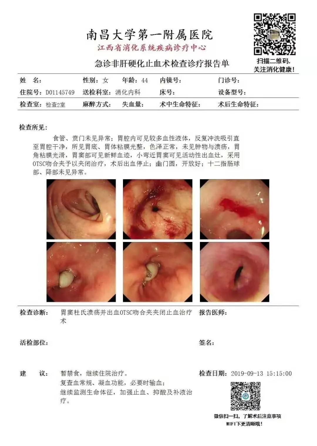 急诊胃镜示:小弯近胃窦侧活动性出血灶活动性渗血,采用OTSC吻合夹予以夹闭治疗,检查诊断:胃窦杜氏溃疡并出血OTSC吻合夹夹闭止血治疗术。