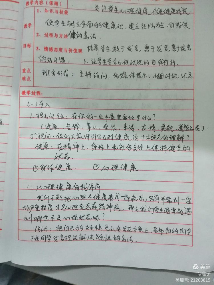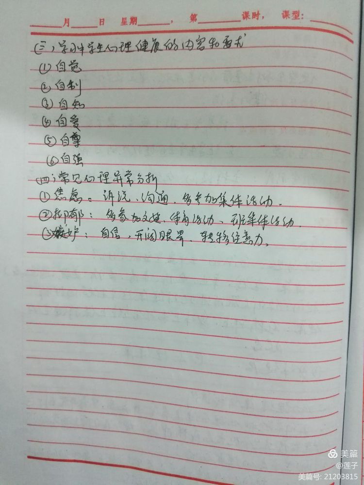 2、召开一次主题班会,班主任认真备教案,通过班会课教育,同学们认真聆听,了解到真正的健康还包括心理健康,有心事要敞开心扉,主动沟通交流。