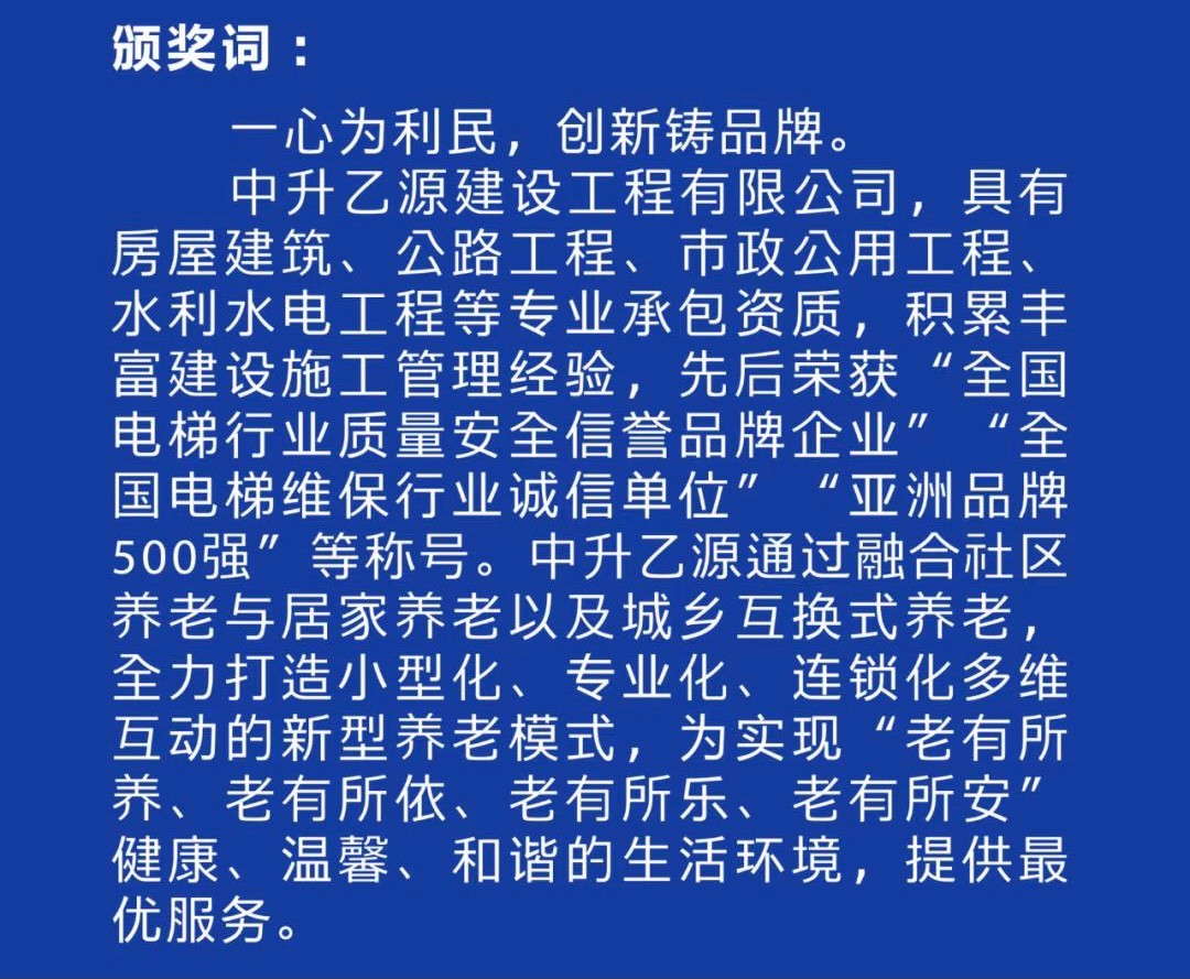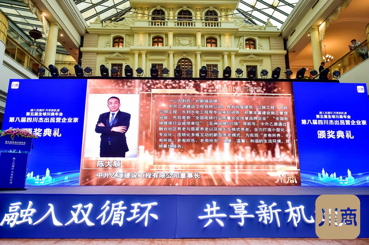 年会上,隆重揭晓了第八届四川杰出民营企业家各奖项获奖名单,22位企业家获殊荣。一同见证荣耀!中升乙源董事长陈大顺荣获第八届四川杰出民营企业家和杰出川商创新奖两项殊荣。颁奖词写到:一心为利民,创新铸品牌。中升乙源建设工程有限公司,具有房屋建筑、公路工程、市政公用工程水利水电工程等专业承包资质,积累丰富建设施工管理经验,先后荣获“全国电梯行业质量安全信蒼品牌企业″“全国电梯维保行业诚信单位”“亚洲品牌500强”等称号。中升乙源通过融合社区养老与居家养老以及城乡互换式养老全力打造小型化、专业化、连锁化多维互动的新型养老模式,为实现“老有所养、老有所依、老有所乐、老有所安健康、温馨、和谐的生活环境,提供最优服务。