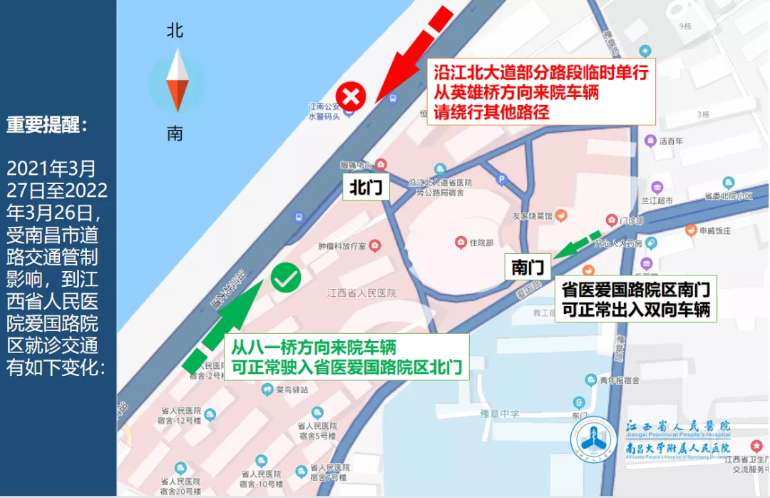二、从八一桥方向来车,经沿江北大道可以正常驶入爱国路院区北门。