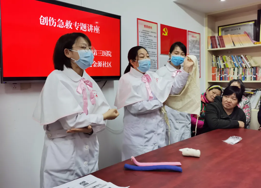 护理部科护士长熊冬梅和武汉抗疫英雄吴莹、涂堃,为社区居民讲解了家庭常见创伤的急救方法,演示了拨打救援电话、情况判断、止血、包扎、固定、搬运的要点及操作方法,让居民掌握了一些简单实用的急救技能,提高了居民的家庭急救知识。居民们兴趣盎然,在课堂上边听边记热情高涨。期间,耐心解答了居民关心的新冠疫苗接种问题。