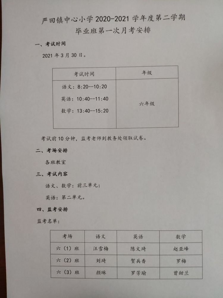 转眼一个月过去了,为了检测一个月以来学生的学习效果和教师的教学成果,根据学校安排,2021年3月30日,严田镇中心小学六年级组织了本学期第一次月考。