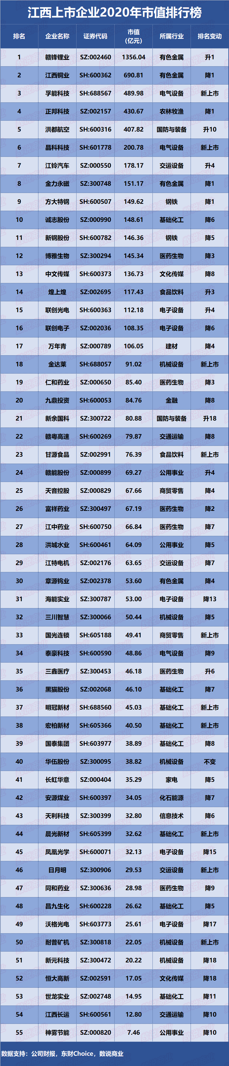 赣锋锂业、洪都航空、江铃汽车等在内的8家企业市值排名均为上升,其中新余国科上升最快,市值排名由上年同期的第39提升至第21。
