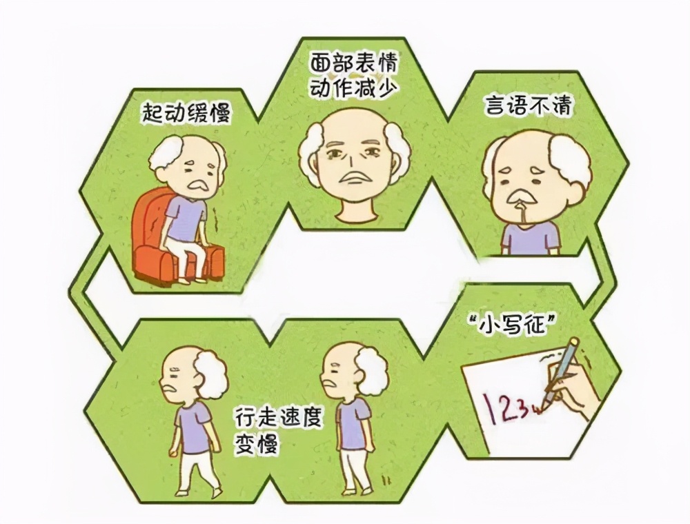 指动作缓慢,在日常生活中穿衣、刷牙、洗脸等动作变慢,写字越写越小,走路时无法迈开脚步,而以小碎步前进