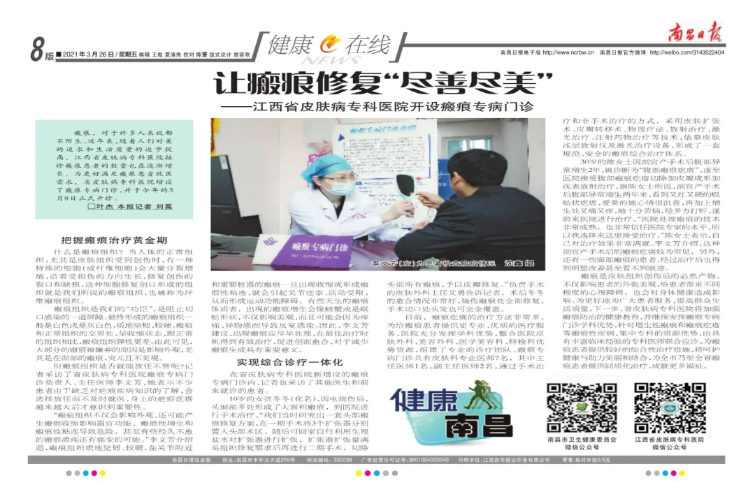 瘢痕,对于许多人来说都不陌生。近年来,随着人们对美的追求和生活质量的逐步提高,江西省皮肤病专科医院接诊瘢痕患者的数量也在逐渐增长。为更好满足瘢痕患者就医需求,省皮肤病专科医院增设了瘢痕专病门诊,并于今年的3月8日正式开诊。