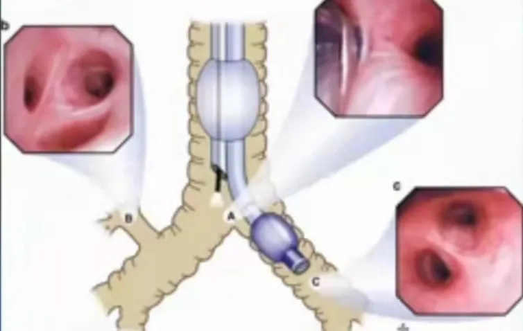 2、由于肺灌洗时需要一个通畅的液体流入与吸出的通道,故应选择尽量宽大的双腔管,我们需要找到气管最狭窄处并匹配相应的气管导管;