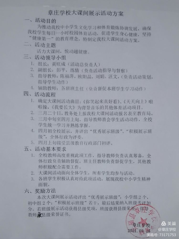 为推动章庄学校中小学生文化学习和体育锻炼协调发展,确保学校学生每日一小时校园体育活动,促进学生身心健康,坚持健康统一的教育理念,制定以下方案。