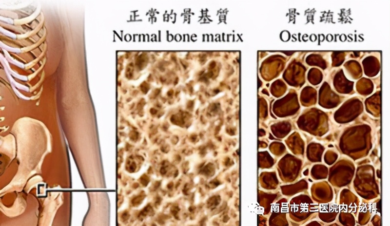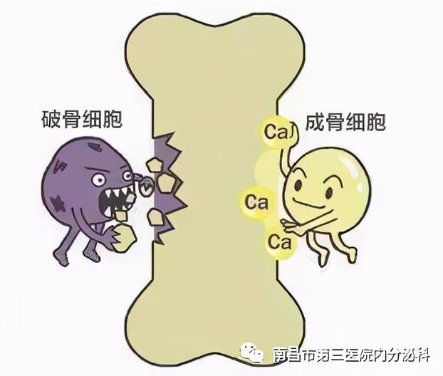 举个典型的例子,甲状腺激素是甲状腺所分泌的激素,甲状腺激素水平正常时,对成骨细胞和破骨细胞的刺激作用相当。甲亢一来,全身代谢亢进,破骨细胞也跟着亢奋,导致更多的钙磷跟着尿液排出了体外,血液中的钙含量就降低了。血液中钙的含量,医学上称之为血钙值,它本来是有一个正常范围的,血钙值飙高时,多出来的钙就存在骨骼里。血钙值降低时,骨头就拆点钙扔进血液,来保证血钙值稳定。甲亢搞得钙都跟着尿溜走了,血钙值就偏低了,破骨细胞也只能拆了骨头往血里扔。时间久了,骨质可不就疏松了嘛!