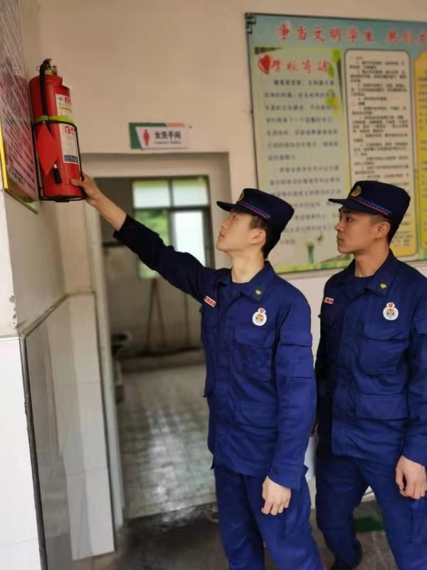 中队消防官兵一行人员首先对学校消防安全现状进行了解,并深入学校综合楼、宿舍楼、教室、学生宿舍、食堂等重点部位查看学校的消防栓的位置,检查学校的消防设施、灭火器材等配备是否配齐配足,并对学校食堂厨房的电气设备进行检查,并提出了整改意见,同时在食堂对工作人员进行一次应急的消防灭火演练。